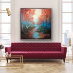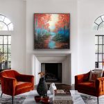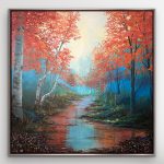 A tranquil forest glows in peak autumn color, its reflection mirrored in a winding stream below. Autumn’s Mirror captures a moment of deep stillness and vivid transformation. The contrast of phthalo blue and pyrrole red gives the piece an energy and depth that’s heightened by the sparkle of natural materials. Layered in paint, gemstones, and glass, the piece is both peaceful and radiant—changing subtly with the light and the viewer’s perspective.