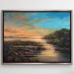 As dawn unfolds, light spills across the water in a gentle tide of gold and rose. The landscape awakens beneath a tranquil sky, where subtle shimmer from glass, glass glitter, and mica brings the scene to life. Awakening Tide captures that fleeting moment when stillness gives way to motion, and the promise of a new day begins to glow across the horizon.