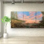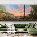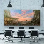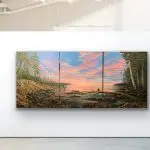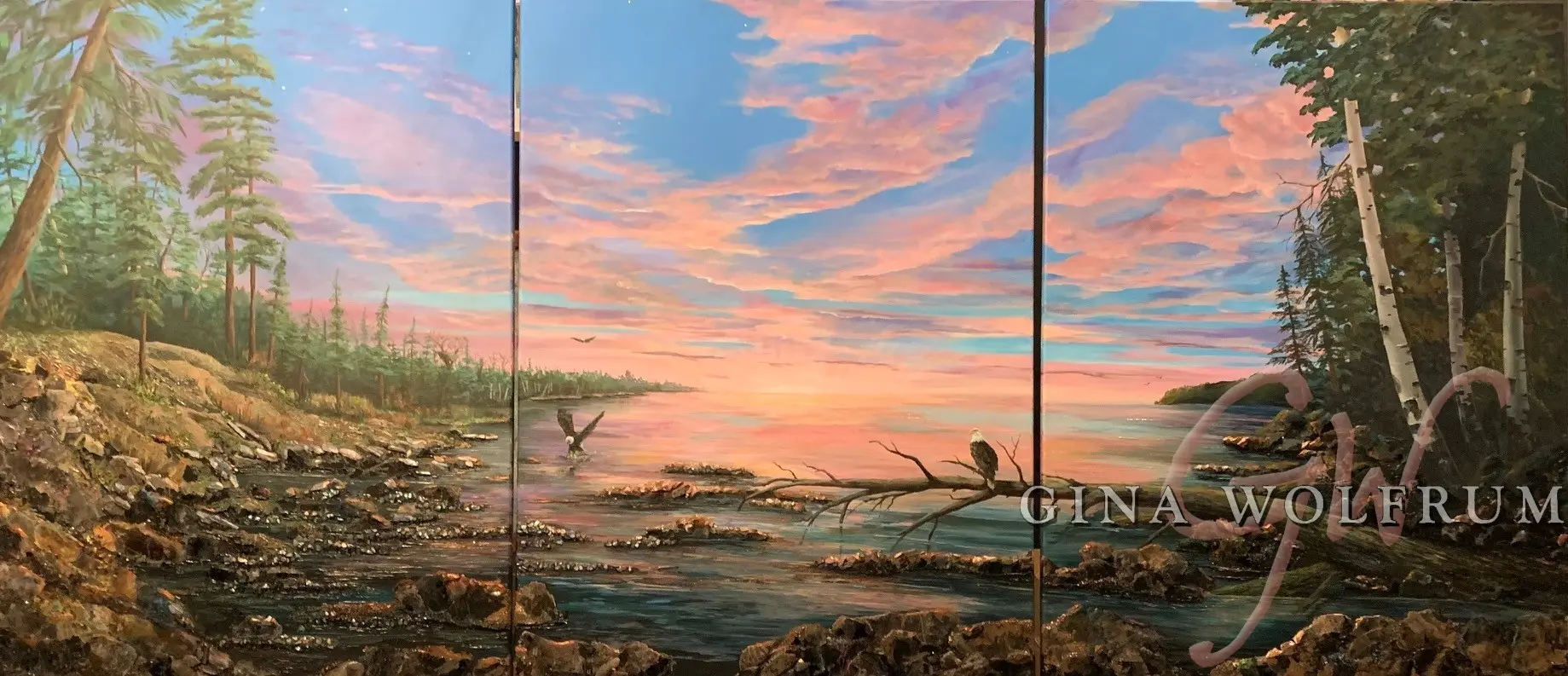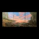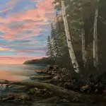 I often paint intuitively, letting the canvas tell me where it’s heading. Awe of the Eve started as a dramatic evening sky with silver-lined clouds of pinks, lavenders, and blues that developed into a peaceful landscape including pines and Aspen trees. The Great Lakes were in the back of my mind as I painted this, knowing of the many coves and inlets of our northern lakes’ region. In the end, bald eagles were included to examine the awe of the evening sky.