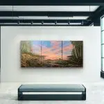 As part of my gemstone series, this 4’x9′ (48″ x 108″) triptych painting incorporates various gemstones including Swarovski crystals for stars, large chunk mica, Petoskey stone, peridot, abalone, pink opal, obsidian and finely chipped flint. The natural elements combined with textural acrylics create a dynamic scene that changes as your posture and perspective vary; similar to life, our views can change as we change.