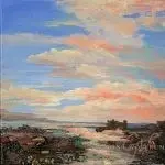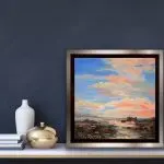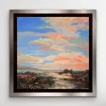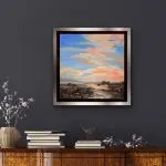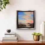 Big Sky – a 10×10 mixed-media painting on gallery wrapped canvas nestled in a silver edged black floater frame. Gemstones include Carnelian, tourmaline, citrine, and mica. Carnelian captivates in much the same way that the flash of a fiery sunset or the first blaze of autumnal brilliance does. It symbolizes bold energy, warmth, and a joy that lingers as much as it empowers and stimulates.