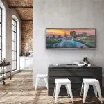 Created specifically for a Columbus exhibition, this piece celebrates the rhythm of the city as seen from the river’s edge. The bridges arc gracefully across the composition, grounding the scene while the skyline rises with confidence behind them. Layers of glass and reflective materials are embedded throughout the surface, catching and refracting light so the painting subtly changes as you move past it—much like the city itself at dusk.