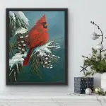 Winter’s quiet hush meets a flash of bold red brilliance. This cardinal perches confidently on snow-tipped pines, a symbol of hope, warmth, and that little spark of joy that brightens even the frostiest days. Layers of mica and glass glitter bring the scene to life — subtle shimmer catches the light and pulls the eye in, creating movement and magic as you shift your view. A timeless nod to nature’s beauty, and a comforting reminder that we are never alone in the cold.