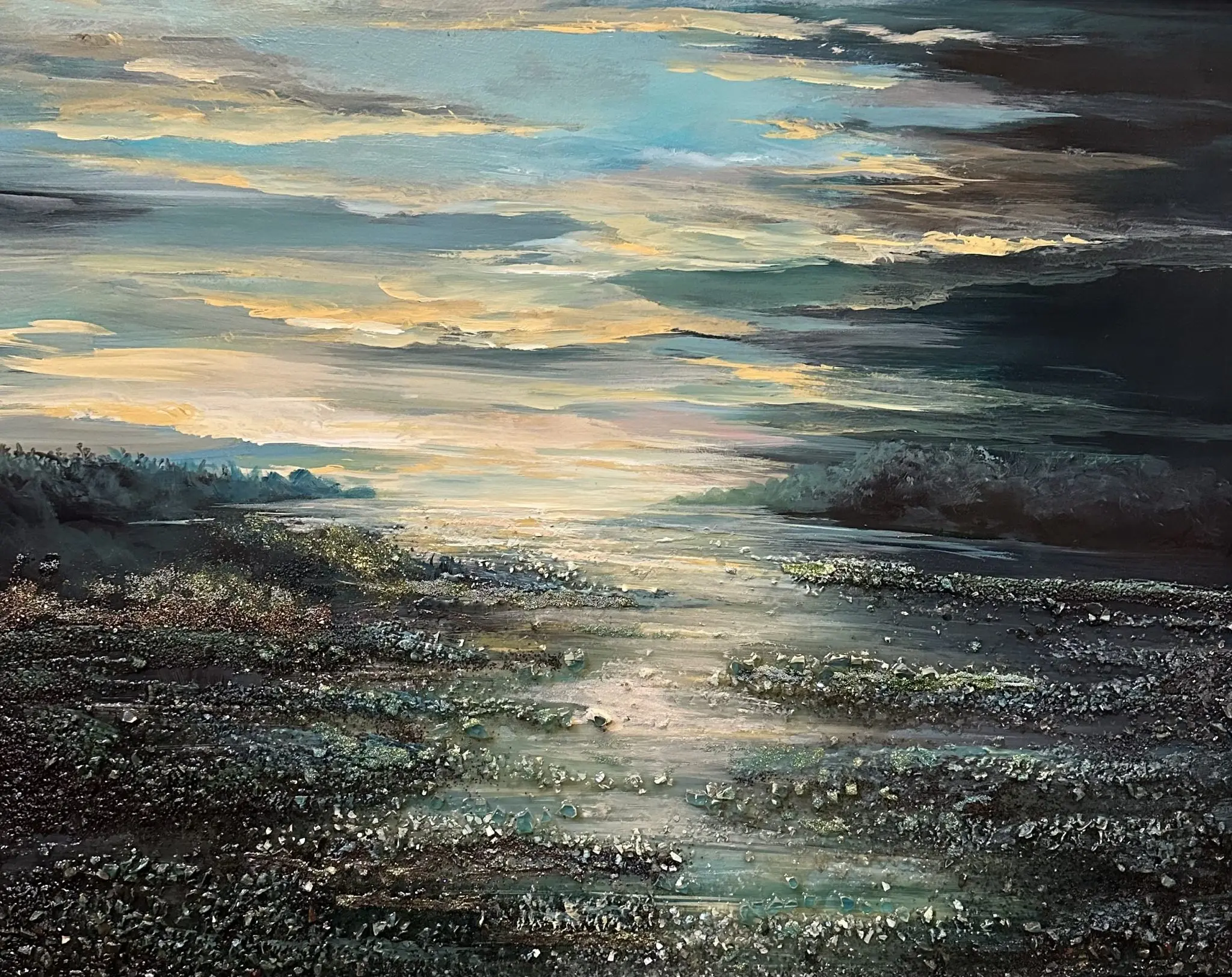 Dusky Devotion captures the enchanting serenity of a twilight horizon, where hues of teal and gold meet a shimmering, textured landscape. This one-of-a-kind piece incorporates an exquisite array of gemstones, including Dragon’s Blood, Tourmaline, Obsidian, Peridot, crushed glass, and mica, creating a luminous surface that sparkles and shifts with the light.