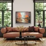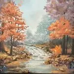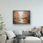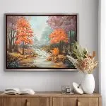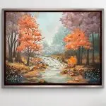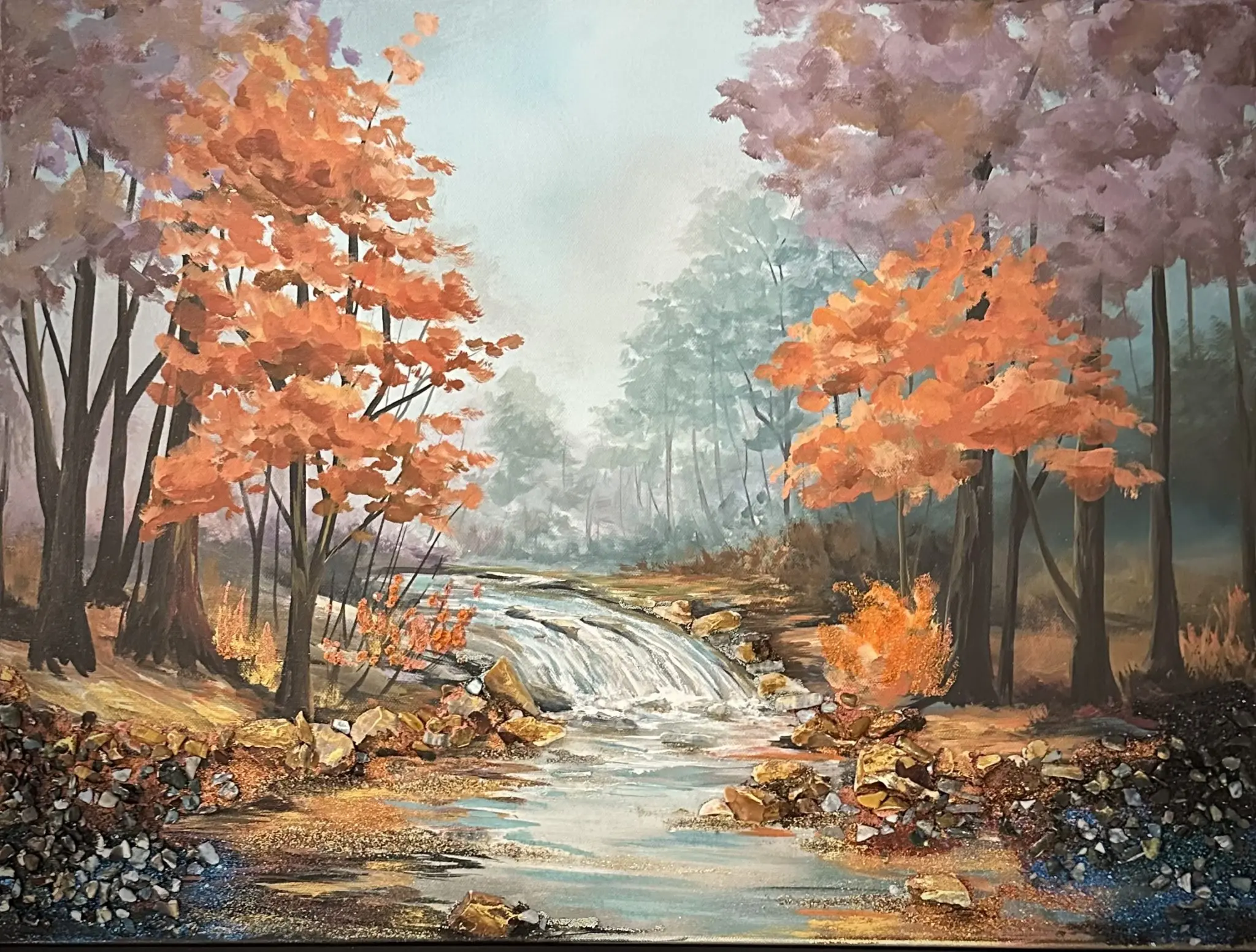 Part of Gina Wolfrum’s Gemstone Series, Golden Drift captures the serene beauty of an autumn creek, surrounded by warm, glowing foliage. The shimmering waters and rocky banks are brought to life with the incorporation of tiger eye, bloodstone, abalone, microglass beads, mica, and glass glitter. These natural and sparkling elements enhance the scene, inviting the viewer to explore the interplay of light, texture, and depth. Displayed in a sleek silver-trimmed floater frame, this piece offers a timeless blend of elegance and tranquility.