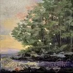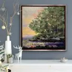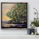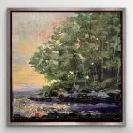 Golden Hour Secrets” captivates the observer with its breathtaking 10×10″ landscape, showcasing a mesmerizing fusion of yellow and pink hues in the sky. The sun’s warmth bathes the scene, the vibrant colors of the sky gracefully peek through the branches, creating a harmonious dance of light and shadow. True to the artist’s distinctive gemstone series, the shoreline is adorned with exquisite gemstones, including the radiant hues of tourmaline, the golden glow of citrine, the fiery energy of carnelian, and the shimmering allure of mica. These gemstones add a touch of mystique and elegance to the natural beauty of the landscape. The painting is framed in a warm silver floater frame with a black interior, accentuating the vivid colors and making the entire composition pop with an undeniable sense of sophistication and allure. “Golden Hour Secrets” invites viewers into a world where nature and precious gemstones seamlessly intertwine, creating a piece that is both visually exciting and spiritually enriching.