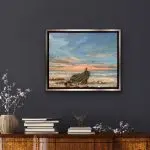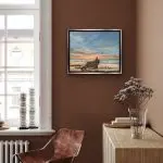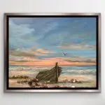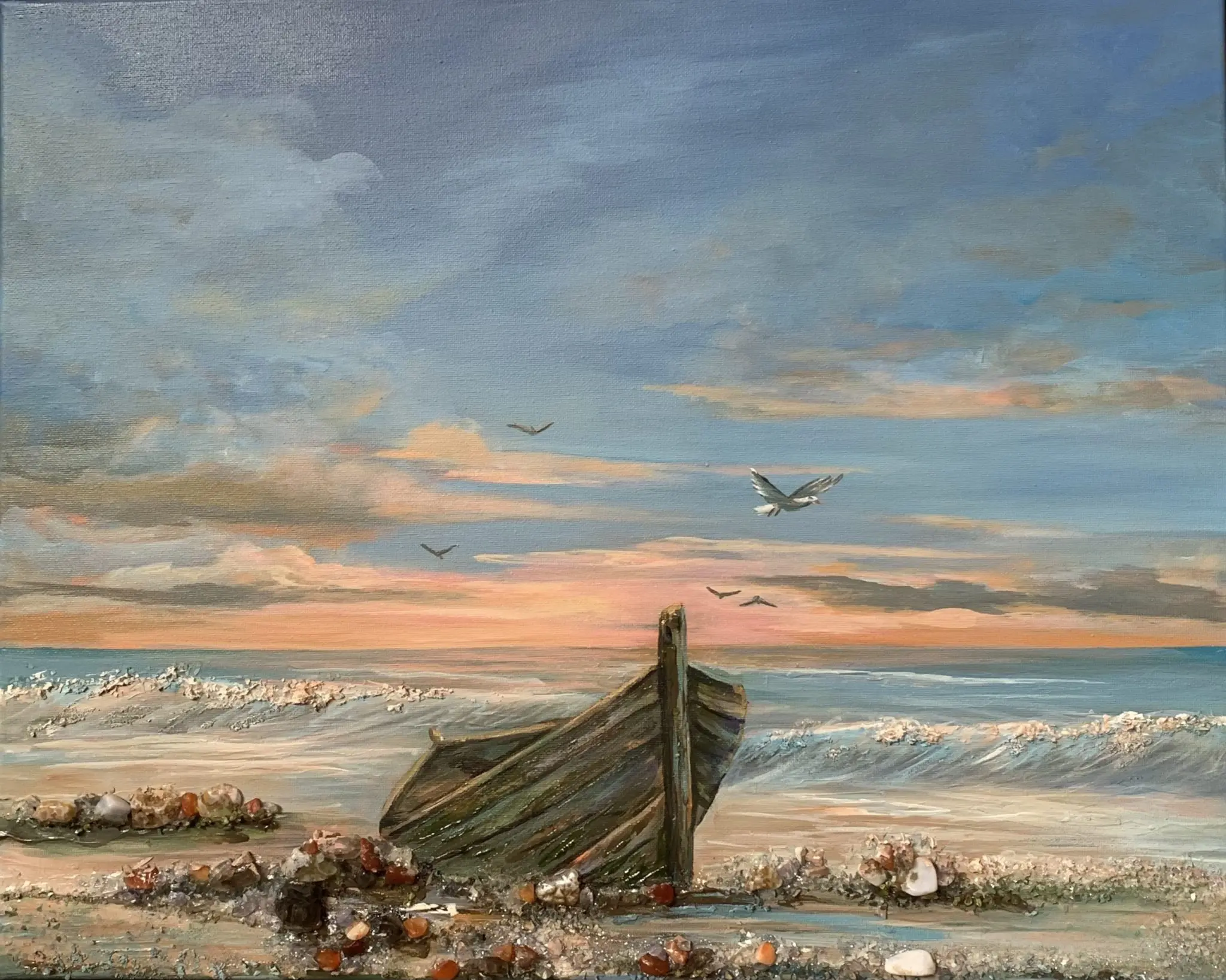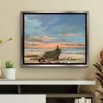 Gone Ashore is a mixed-media acrylic on 16×20 stretched canvas painting nestled in a warm silver floater frame. A much-loved wooden boat is nestled amongst various shoreline rocks of carnelian, smoky quartz, blue lace agate, and mica. The added gemstones add not only color and textural interest, but they have representative properties. Carnelian is known for being a stone of courage, endurance, energy, leadership, and motivation. The smoky quartz signifies stability and grounding, so much so that the crystal is called the “grounding stone.” Blue lace agate is characterized by water energy, the energy of stillness, quiet strength, and purification. I choose my gemstones for both color and property for the greatest possible effect.