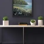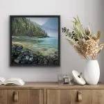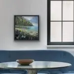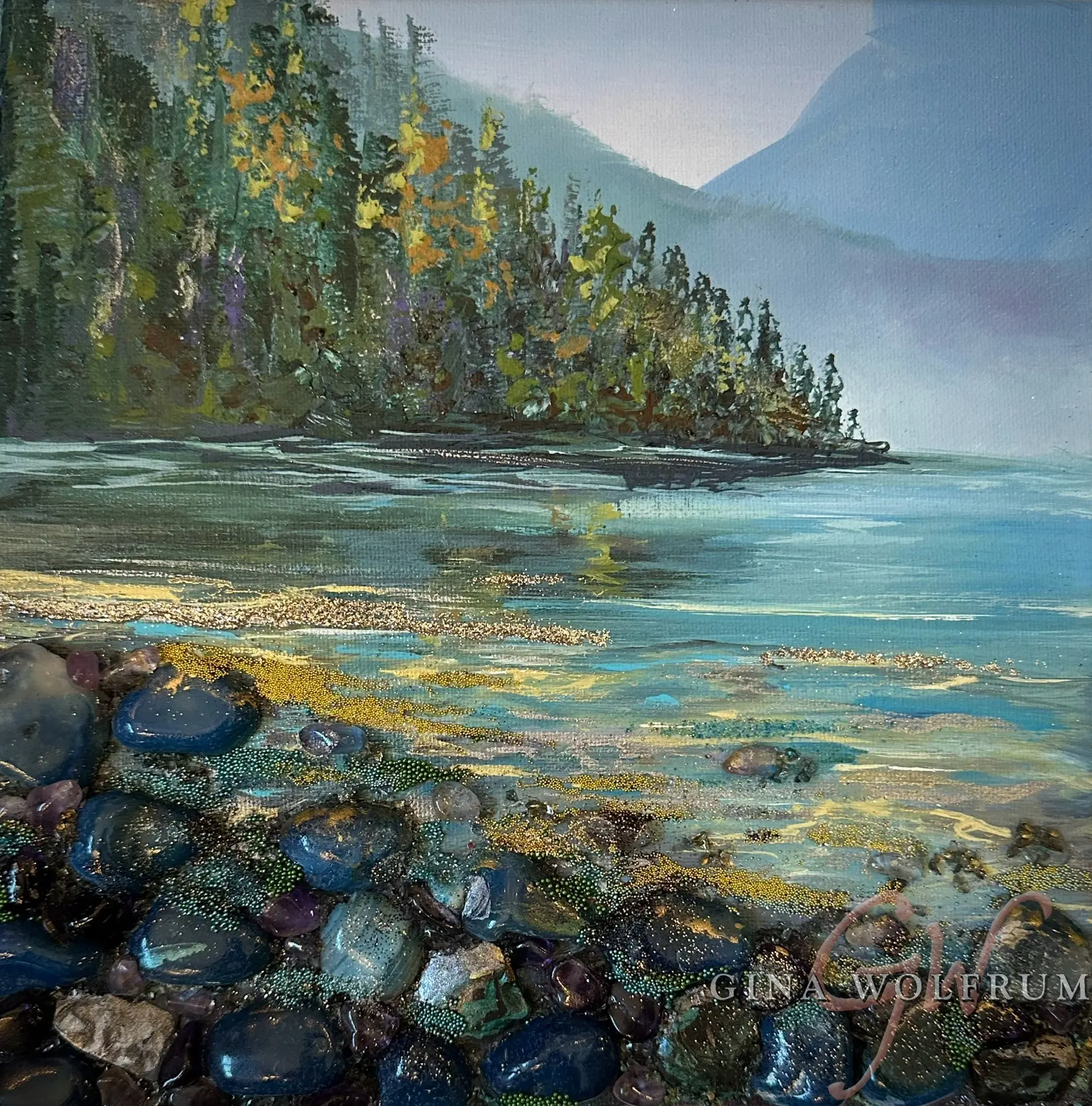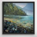 Mystic Flow is an elegant 10×10″ original artwork, presented in a black floater frame. This serene painting captures the calming essence of nature with its vibrant portrayal of a tranquil lakeside scene. Featuring a stunning blend of gemstones, the piece incorporates natural elements and sparkly textures that add depth and allure. The careful application of colors and textures evokes a sense of calm and tranquility, making “Mystic Flow” a perfect addition to any space seeking to embrace the beauty of nature’s serenity. Ideal for collectors of unique, original artwork, this painting is a testament to the harmonious fusion of art and nature.