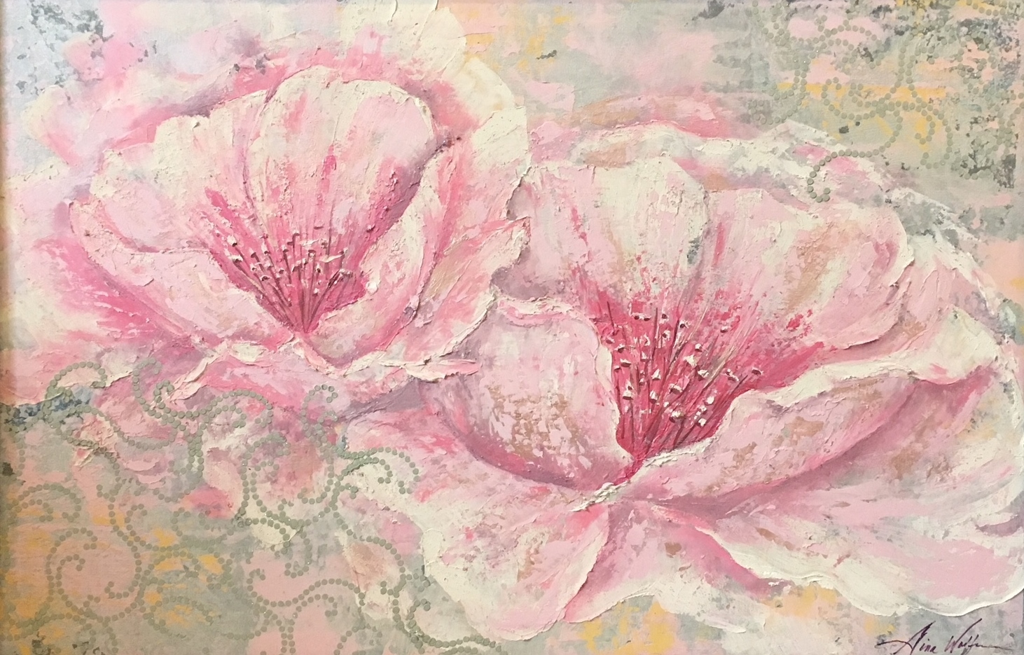 Peonies in May is a whimsical painting of one of my favorite flowers. It’s hard to choose just one favorite, but the aroma of the peony is absolutely heavenly. There are many peony hybrids; this is the single blossom that is a more open and available to our honey bees, who are so important to our environment! Peonies in May is very textural and has a colorful background that would compliment most interiors. 24×36″ acrylic on stretched canvas nestled in a floater frame.