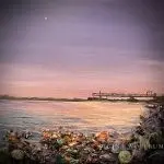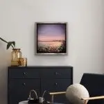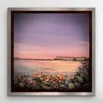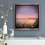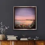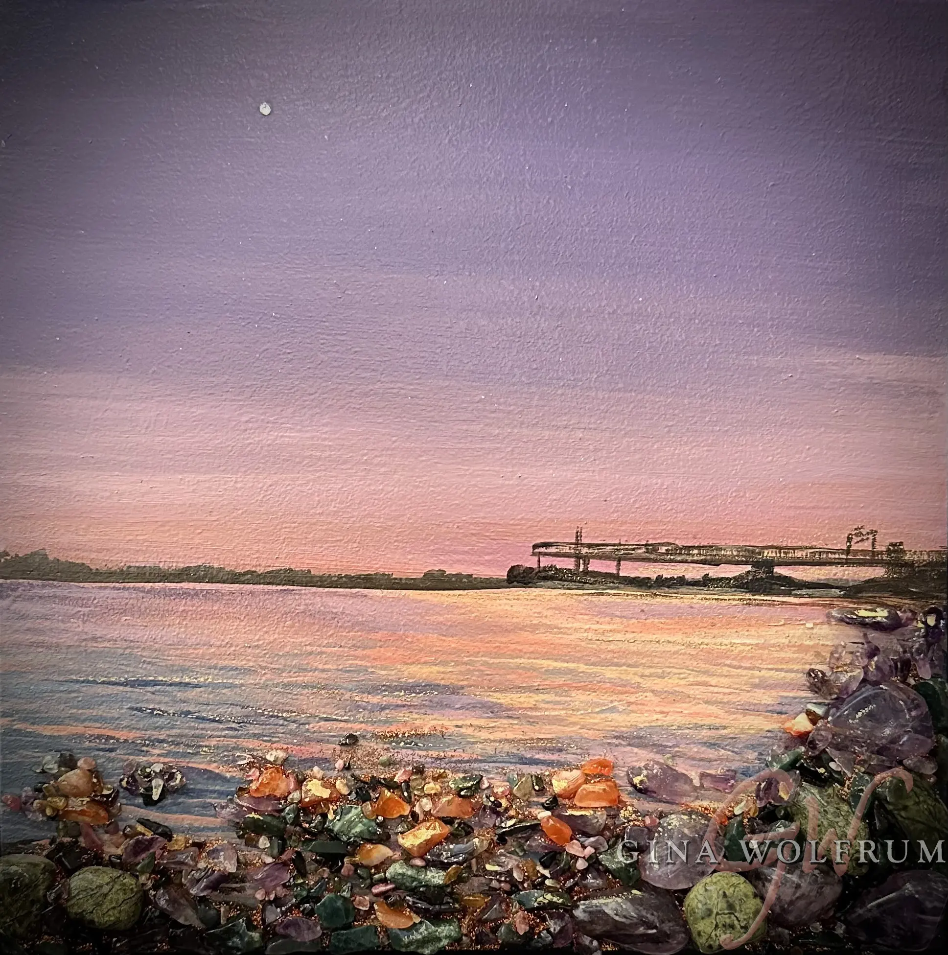 Pier Reflections is a captivating 12″x12″ mixed-media painting presented in a sleek black floater frame. This serene artwork captures a peaceful waterfront scene at sunset, where soft pastel hues of lavender and blush reflect off the rippling water. The foreground features a rich, textural display of amethyst, carnelian, dragon’s blood gemstones, and glass elements, adding depth and sparkle to the rocky shore. The distant pier, silhouetted against the tranquil sky, invites a sense of calm and reflection, making this piece a perfect blend of natural beauty and artistic brilliance.