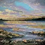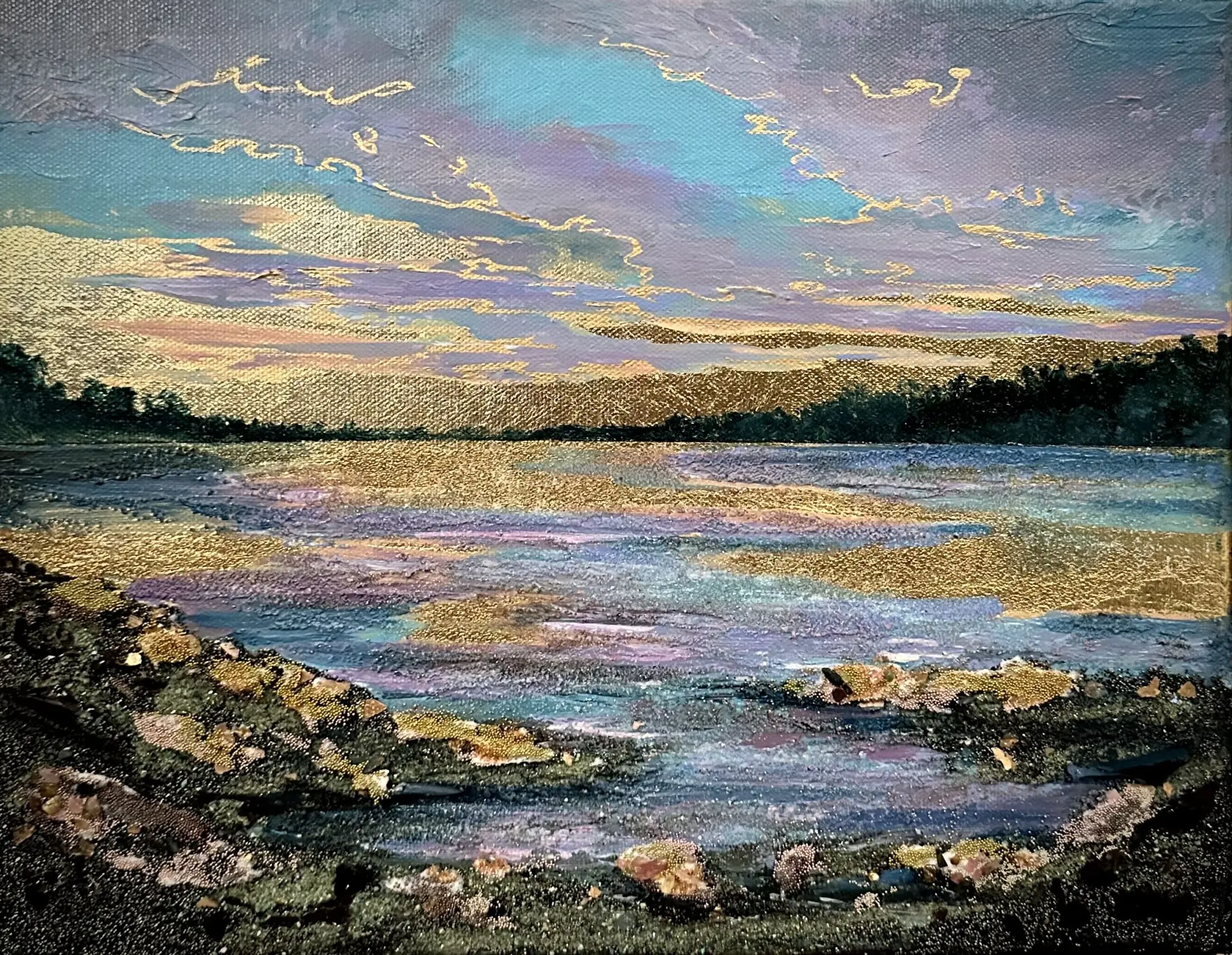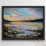 This stunning 11×14 gemstone series painting captures the essence of a tranquil landscape with breathtaking elegance. The artwork features a serene natural scene bathed in the soft glow of gold leaf, both in the expansive sky and the mirrored waters below, creating a harmonious balance of radiance and calm. The gemstones scattered across the foreground are meticulously highlighted with subtle, reflective gold tints, infusing them with an ethereal quality. To complete this masterpiece, it is impeccably framed in a sleek black floater frame, accentuating the artwork’s opulent yet understated beauty, making it a true gem in any art lover’s collection.