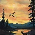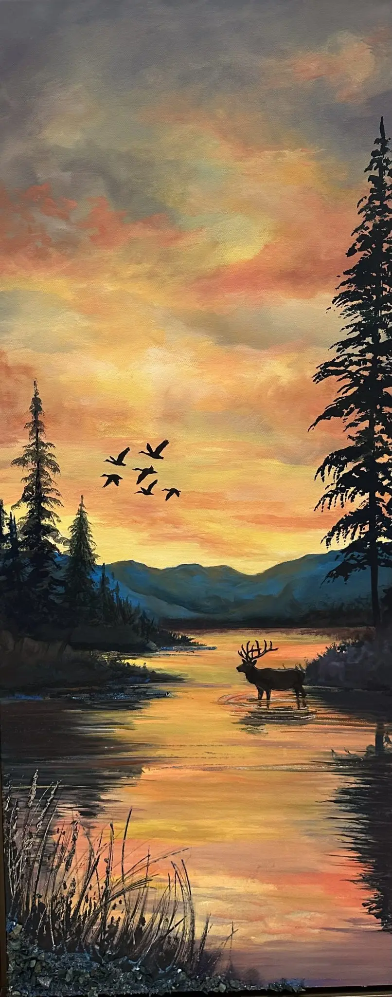 Quiet Crossing lingers in that hushed moment when the day is just beginning to breathe. Soft golden light moves across the water as an elk steps into the quiet, framed by silhouetted pines and distant blue ridges. The warm sky, the reflection, the stillness — it all invites you to pause, take a breath, and settle into the calm of first light.