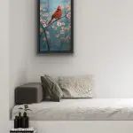 Red is my tribute to that one really red cardinal that stands out from all the others at the feeder. This 24×12 acrylic painting is on a framed stretched canvas, wired and ready to hang. It is currently on display in Auburn at Expressions Gallery.