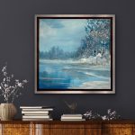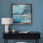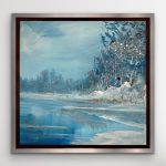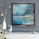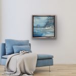 A quiet winter moment unfolds in soft blues and frosted light — the kind of hush that only happens when the world pauses and listens. Subtle glass glitter and mica catch the light just enough to mimic drifting snow and the shimmer of an icy shoreline, inviting you to lean in and take a breath. This small but mighty piece brings that calm, reflective stillness we all crave, especially in the long winter months.