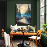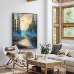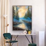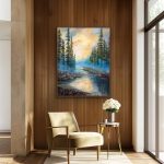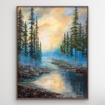 A quiet river winds through towering pines, wrapped in a veil of soft morning mist. The sky glows with golden light, its reflection rippling gently across the surface of the water. This painting holds a hushed, mysterious beauty—where silence and light seem to speak in whispers.